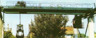 本起重机由箱形桥架,大车运行机构、小车、电气设备及抓斗五部分构成。全部机构均在操纵室内操纵,操纵室分为闭式、开式两种。当露天使用时,带有防雨设备。